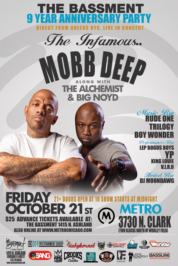 Wow its been 9years…For those of you not in the Chicago Land area, The Basement is a local HipHop Shop or as I like to call it, a all in one shop stop. From Music, Mixtapes, Clothing, and to live music. Shabazz and the boys have been showing myself as well as my label Billion Dollar Ballers and other local talent much, much, much support in what we do…To mark there 9yr anniversary he has set up a party at the Metro on Friday October 21st , and Mobb Deep along with Alchemist will take the stage and rock a show. Peep flyer below for more info and make sure to come out and show support…