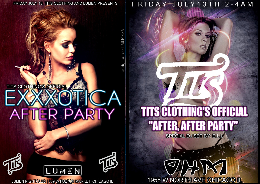 Its going down this Friday here in Chicago. The Tits Clothing Company are in town for “Exxxotica Chicago ” and I will be behind the decks for them representing the Tits fam over at Lumen and Ohm…Peep the flyers for info below or head over to the TwoInTheShirt Blog for more info