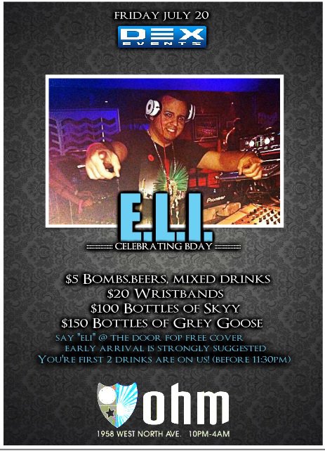 Its going down!!!! This Friday night at OHM as I hit the decks for my birthday bash. All the info is on the flyer below…Remember to say “E-L-I” at the door for NOOOOO COVER!!!!!!!